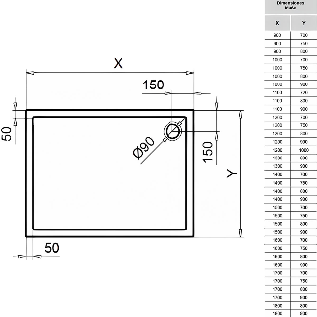 - Maße B (X) x H x T (Y) [mm]: 900 x 55 x 700