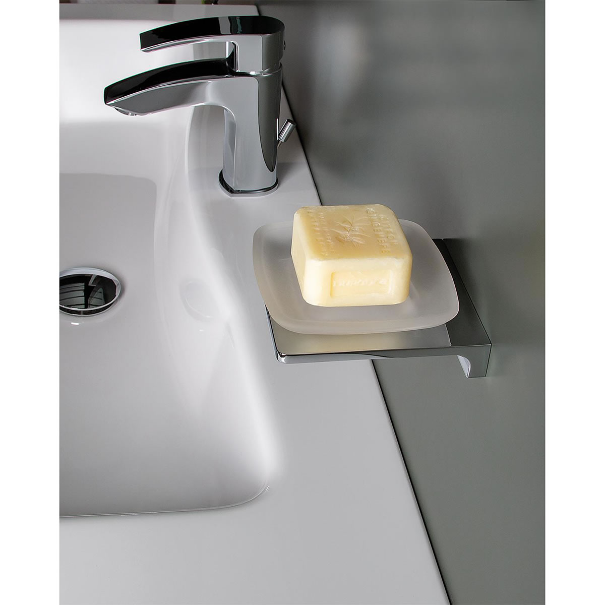Seifenschale Erasmia mit Wandhalter, Zink verchromt, Glas satiniert