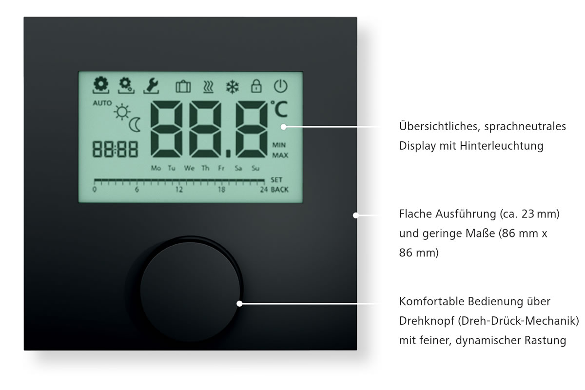 Die Einstellung der gewünschten Raumtemperatur und die Bedienung erfolgt über den Drehknopf mit Dreh-Drück-Mechanik und Softrastung. Über die übersichtliche und sprachneutrale Anzeige des hochwertigen Displays werden die Symbole immer deutlich angezeigt.
