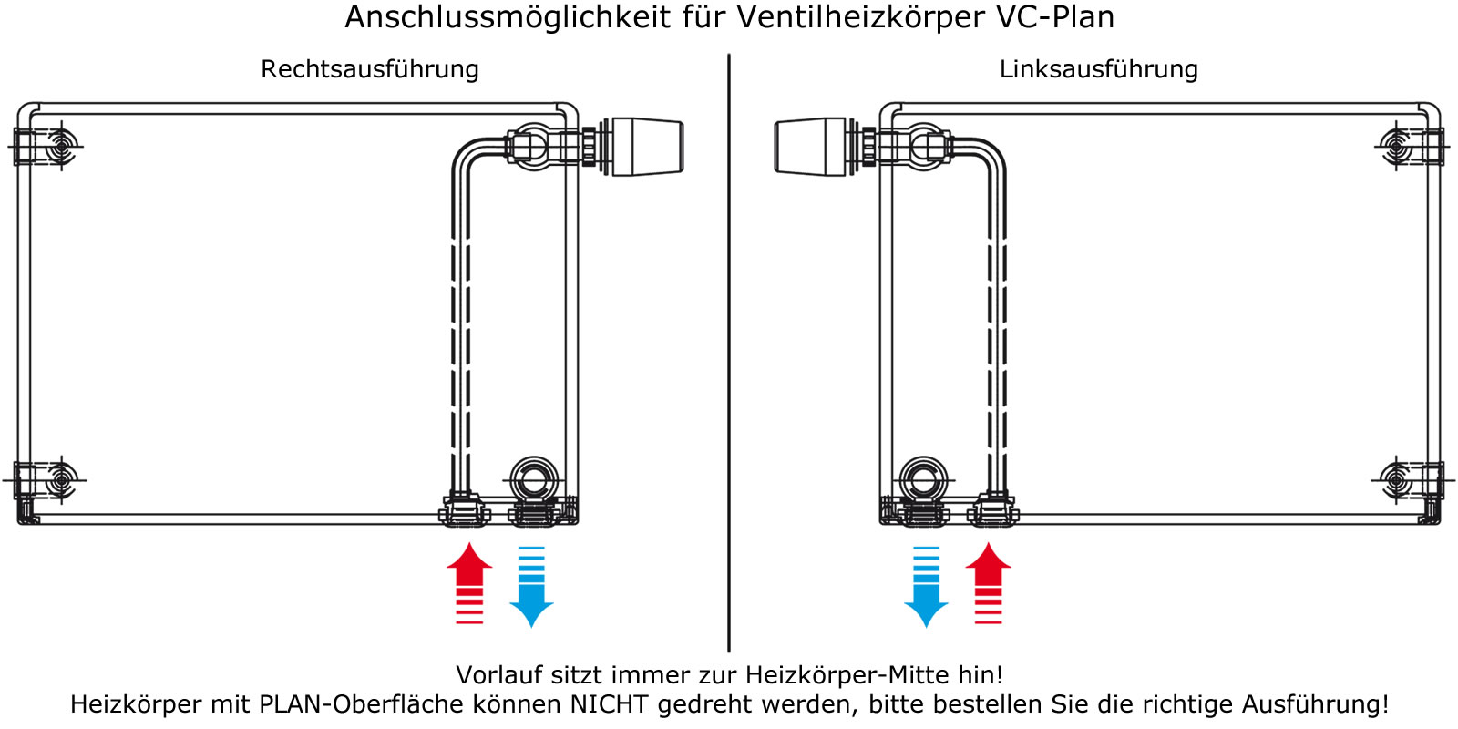 - Standardmäßig liegen der Thermostatkopf und die Rohranschlüsse rechts!