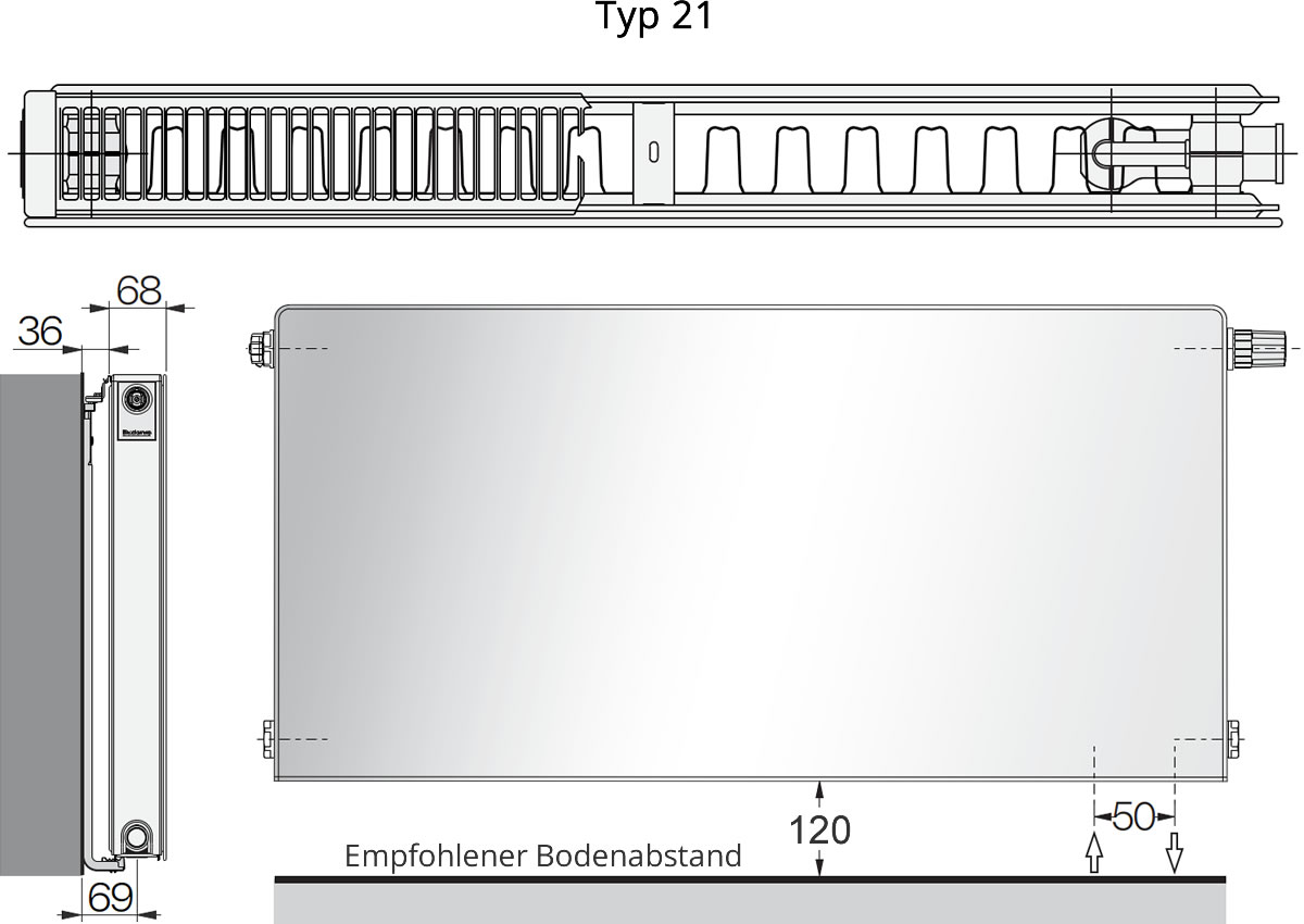 Dies ist ein Ventilheizkörper mit integrierter Ventilgarnitur (das heißt: eingebautes Thermostatventil sitzt oben, Rohranschluss immer von unten) - benötigen Sie einen Heizkörper mit seitlichen Rohr-Anschlüssen empfehlen wir Ihnen den Buderus Logatrend-Kompaktheizkörper