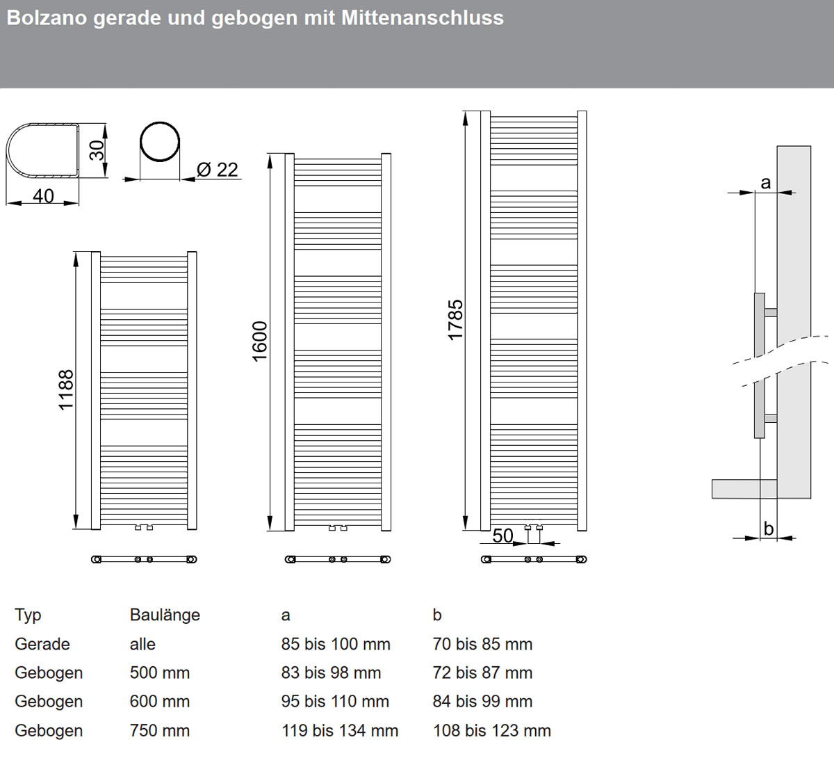 - Klassischer Badheizkörper in gebogener Ausführung für Mittenanschluss unten (Achsmaß 50 mm)