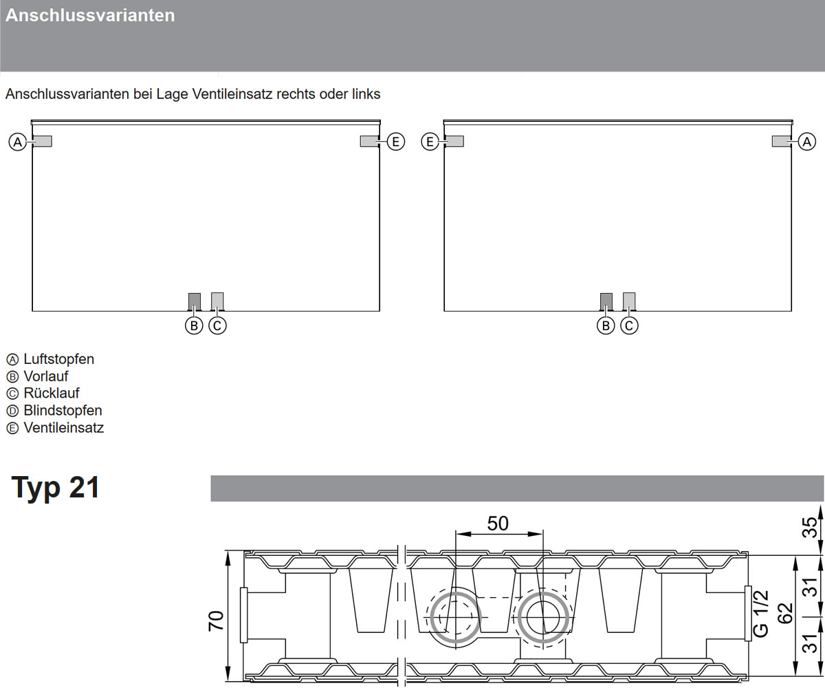 - Anschlüsse: 2 x G 1/2" unten und 1 x G 1/2" seitlich links und rechts