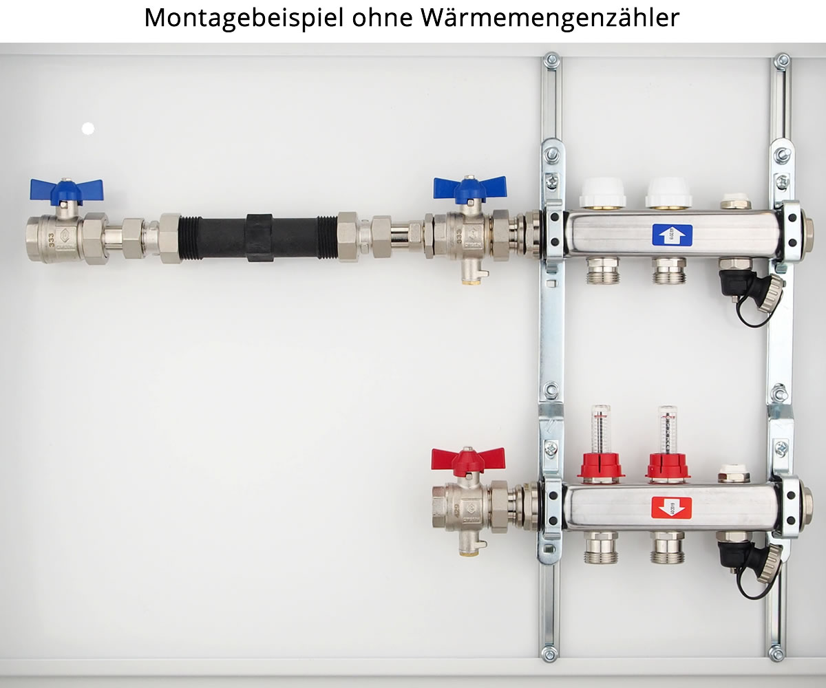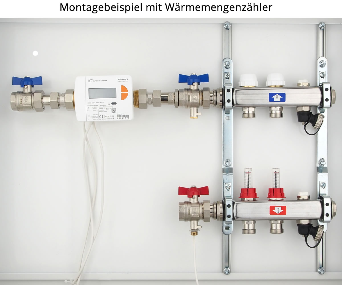 Wärmezähler-Einbau-Set - horizontal - vormontiert - für heima-press FBH- und HK-Edelstahlverteiler, passend für Wärmezähler mit Baulänge 130 mm (Gewinde 1")