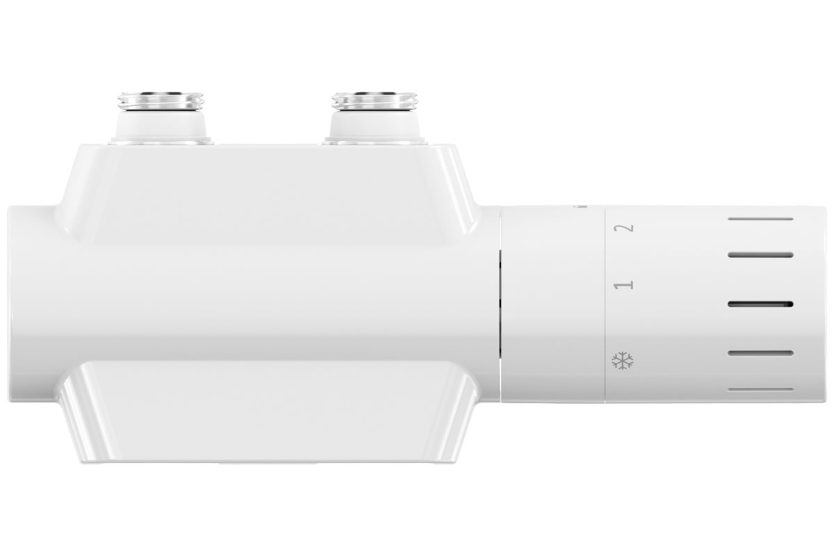 - Bestehend aus Ventil-Hahnblock Universal, Thermostatkopf M 30 x 1,5 und Designblende in weißer Farbe