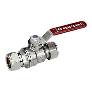 Kugelhahn mit rotem Hebelgriff und vollem Durchgang, Schwermodell, Messing verchromt. Mit Schneidringverschraubung für halbhartes Kupferrohr. Bei Verwendung von weichem Kupferrohr wird der Einsatz von Stützhülsen empfohlen (nicht im Lieferumfang).