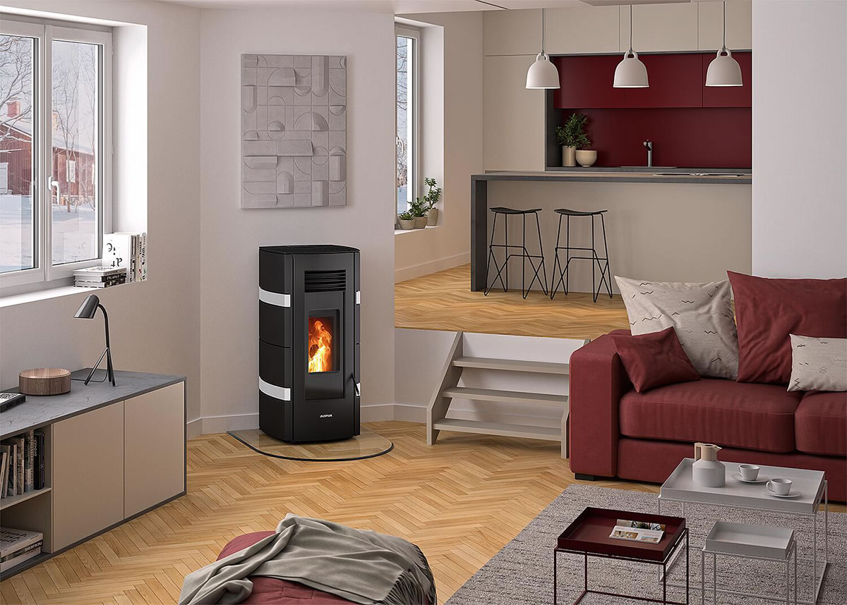 Justus Pelletofen Sia conStone, Seidenweiß, Korpus Stahl Schwarz - 8 kW