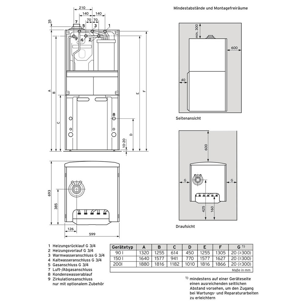 - Integrierter WW-Schichtladespeicher (90, 150, 200 l) mit Magnesium Schutzanode