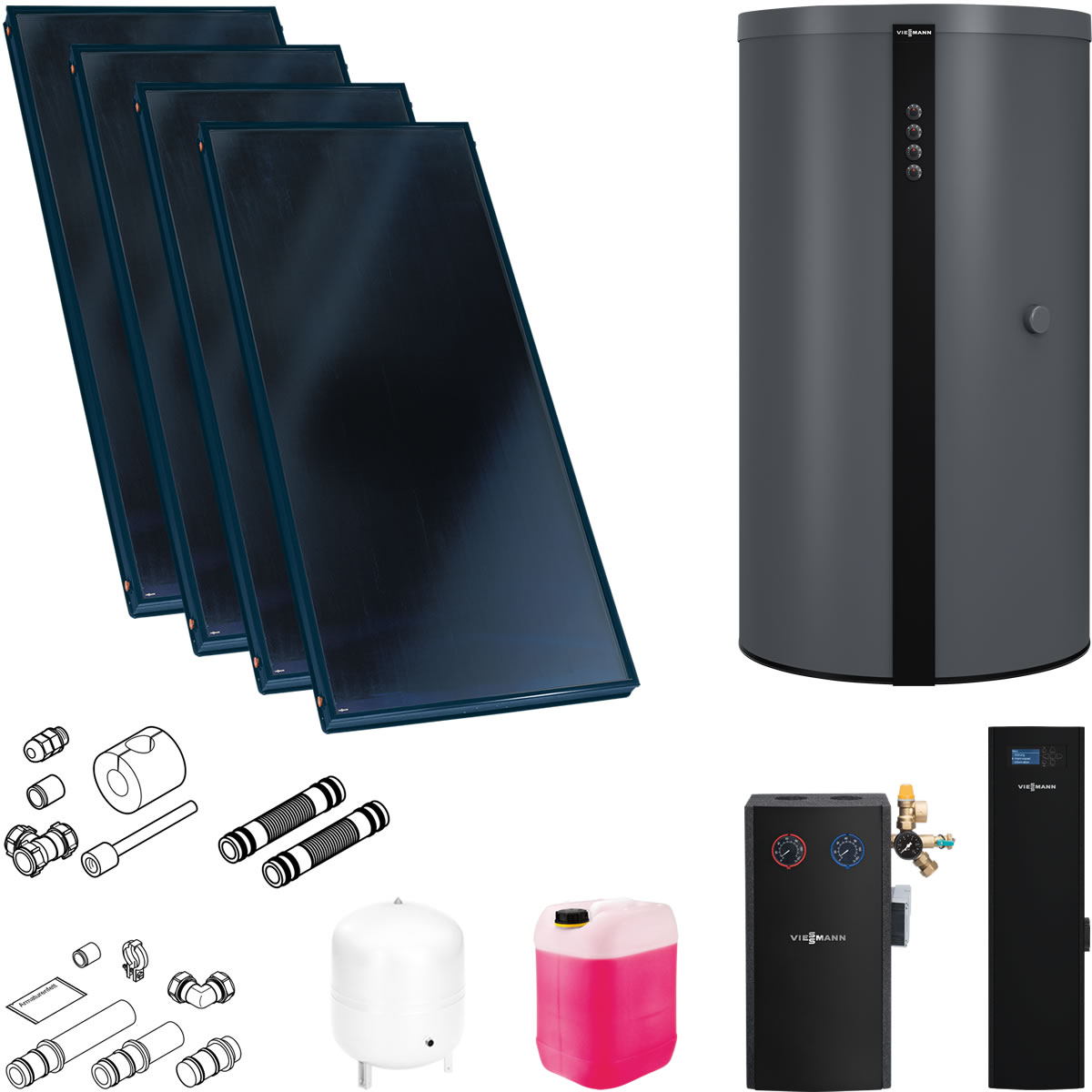 Viessmann Solaranlage mit 4 Stk. Vitosol 200-FM SV2F, Regelung, Pufferspeicher Vitocell 140-E 750l graphite und Frischwassermodul - SK07342