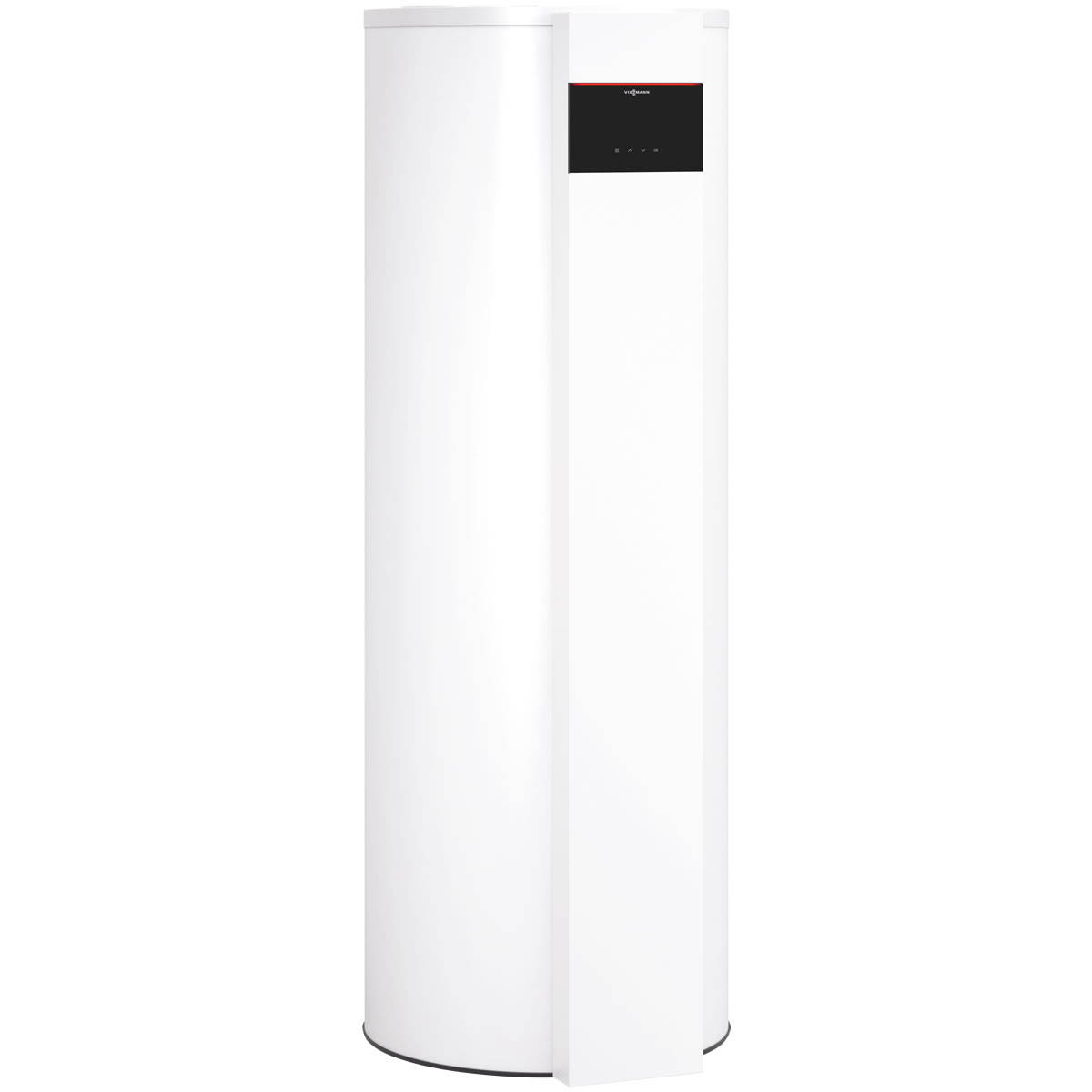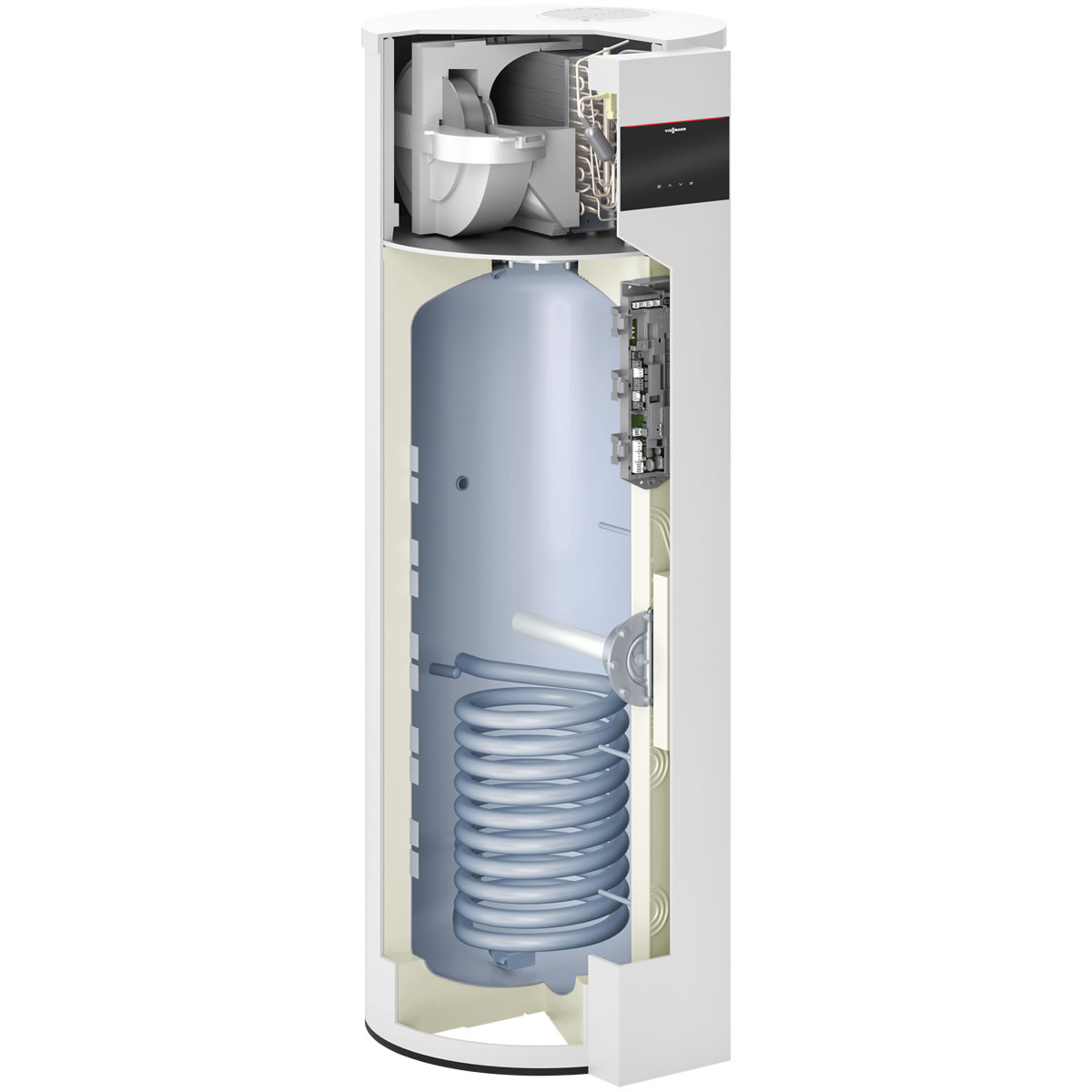 Die kompakte Wärmepumpe Vitocal 060-A in Monoblock-Bauweise ist mit allen Komponenten für eine effiziente Warmwasserbereitung ausgestattet. Neben dem Wärmepumpenmodul enthält das platzsparende Gehäuse einen 250-Liter bzw. 180-Liter-Warmwasserspeicher sowie die Regelung.