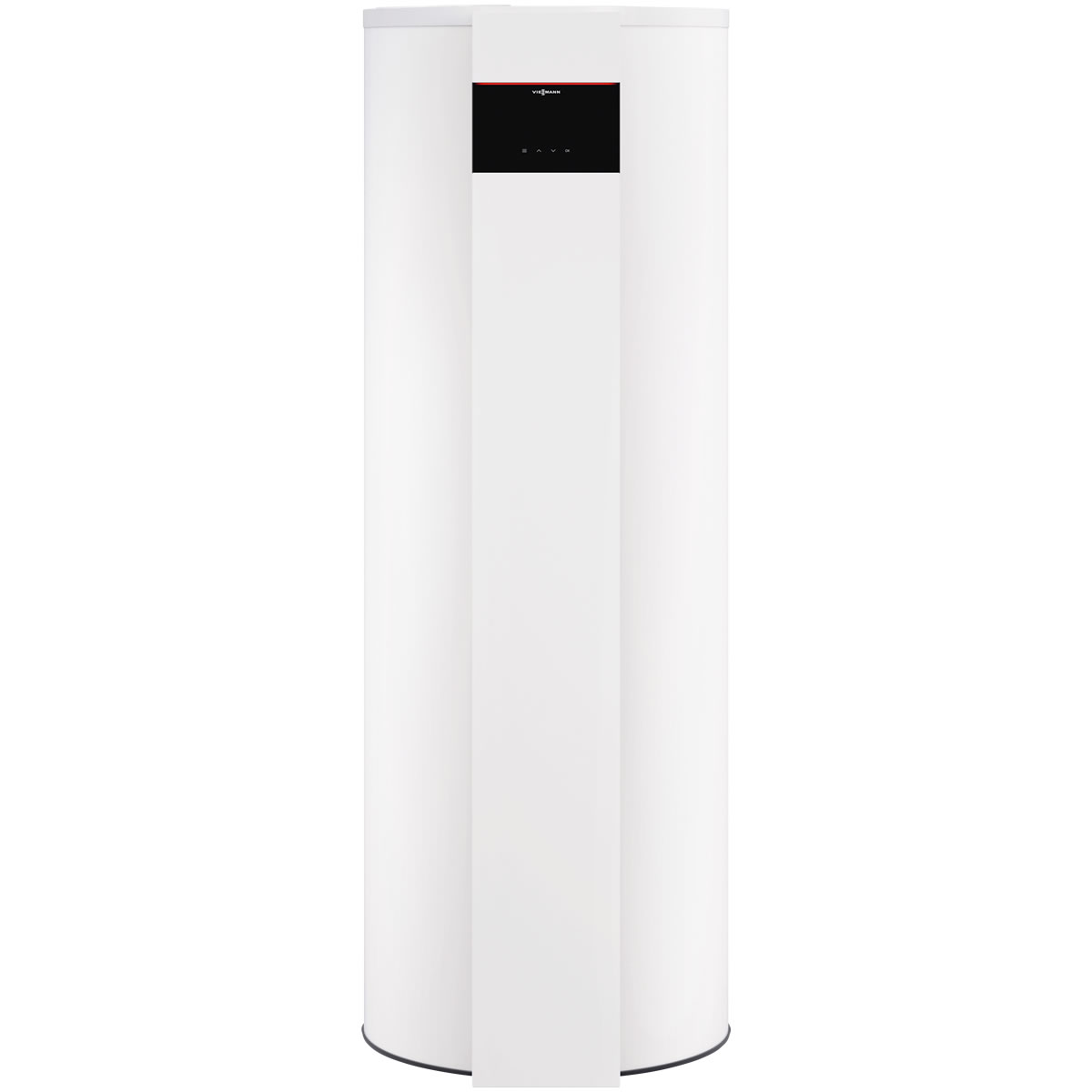 - Senkrecht stehende Trinkwasser-Wärmepumpe zur Innenaufstellung mit integriertem Wärmetauscher zum Anschluss eines Heizkessels oder von Sonnenkollektoren
