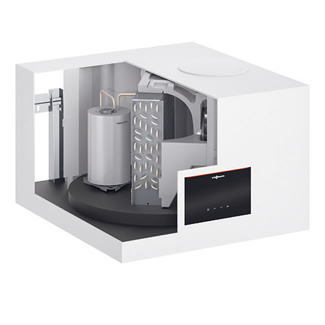 - Kompakte Gerät bestehend aus Luft-Wasser-Wärmepumpenmodul und integrierter Regelung mit Touch-Display (Vitodens 100 Typ)
