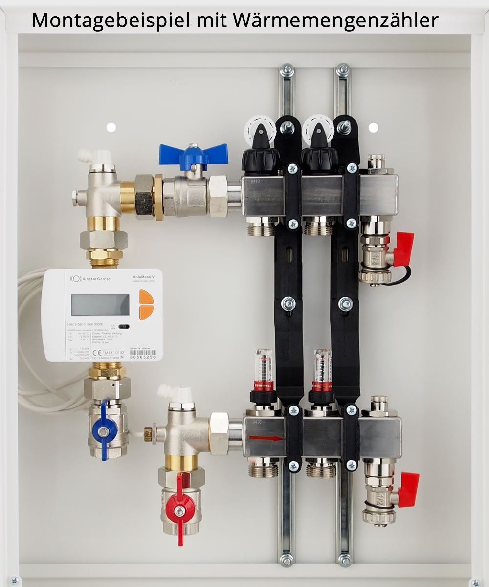Wärmezähler-Einbau-Set - vertikal - vormontiert - für Taconova FBH- und HK-Edelstahlverteiler, wahlweise passend für Wärmezähler mit Baulängen 110 mm (Gewinde 3/4") und 130 mm (Gewinde 1")