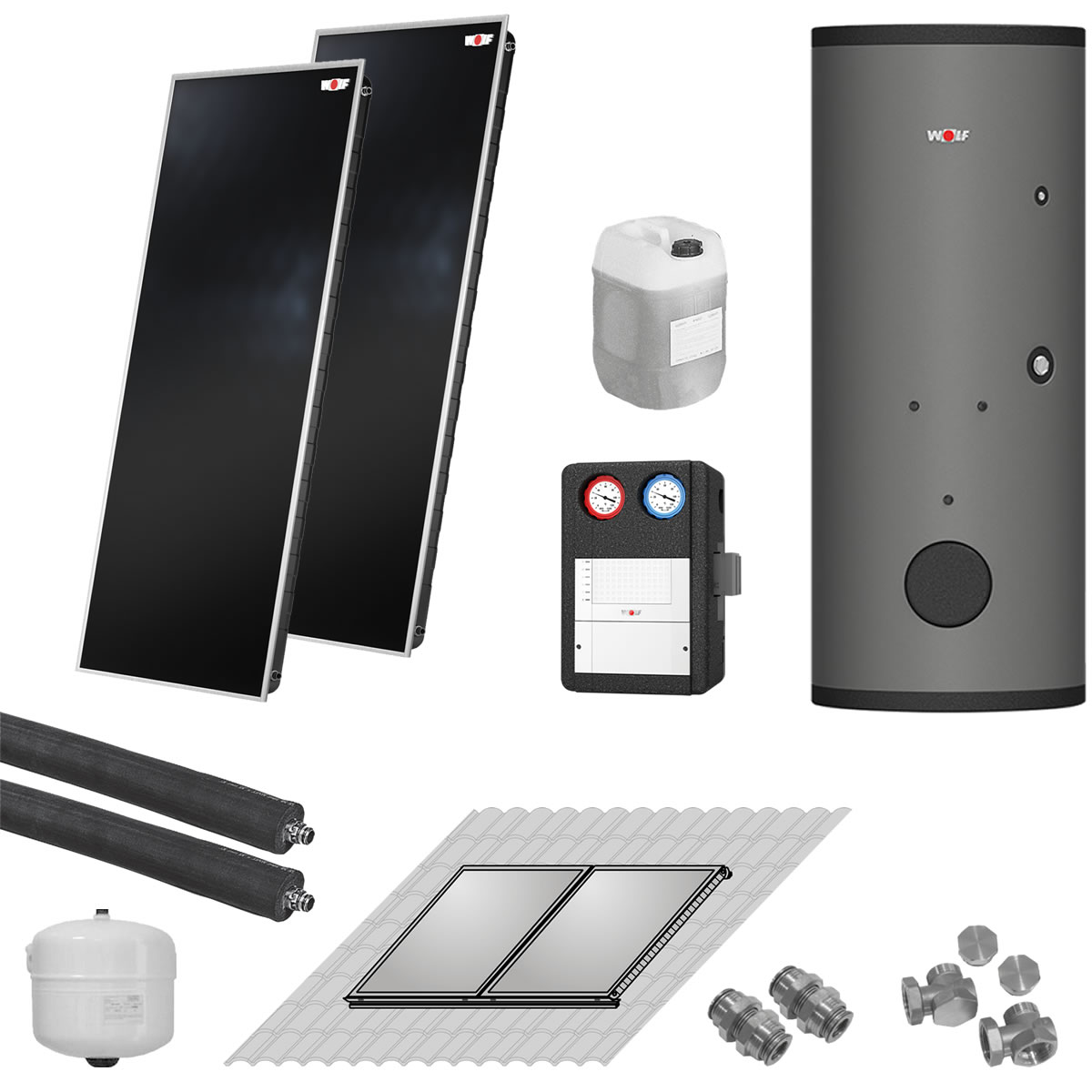 Wolf Thermische Solaranlage (Bruttoabsorberfläche 4,6 m²) mit 2 Stück Hochleistungs-Sonnenkollektoren F3-1 und Warmwasser-Solarspeicher SEM-2-300, bestehend aus: