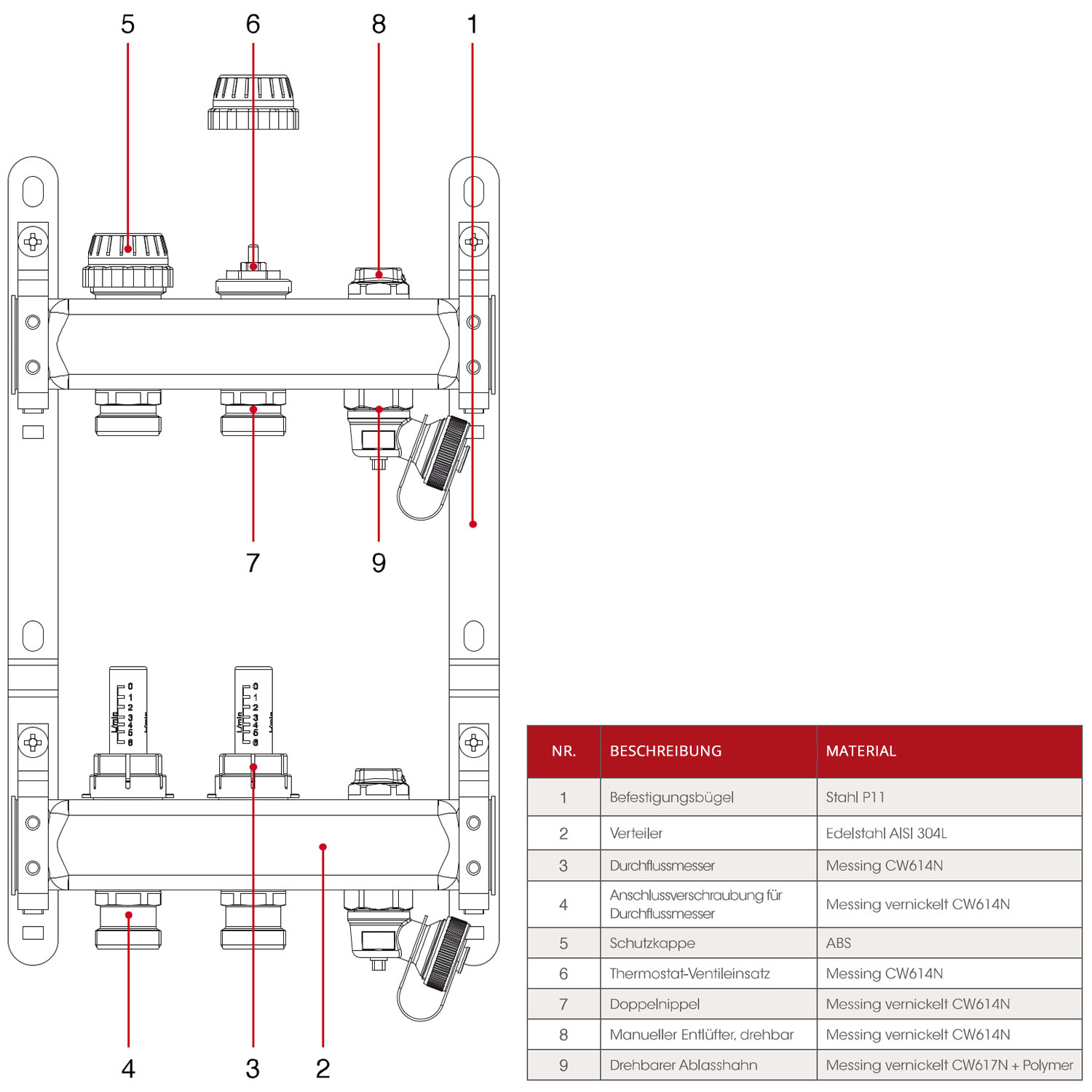 Vor- und Rücklaufbalken werden an das Heizungssystem angeschlossen. Über die optionalen Verschraubungen lassen sich die Heizkreise an die 2-12 Eurokonus-Abgänge (abhängig von der Ausführung), problemlos anschließen. Die ausgelegte Durchflussmenge wird je Kreis am TOPMETER eingestellt. Raumthermostate mit Stellantrieben sorgen für raumindividuelle Behaglichkeit.