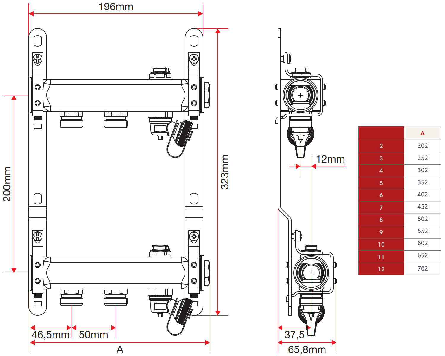 - Rohrabstände der Abgänge: 50 mm (Rohrmitte zu Rohrmitte)