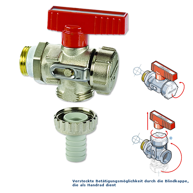 - Versteckte Betätigungsmöglichkeit durch die Blindkappe, die als Handrad dient -> (Flügelgriff leicht abziehbar gegen unbefugtes Betätigen)