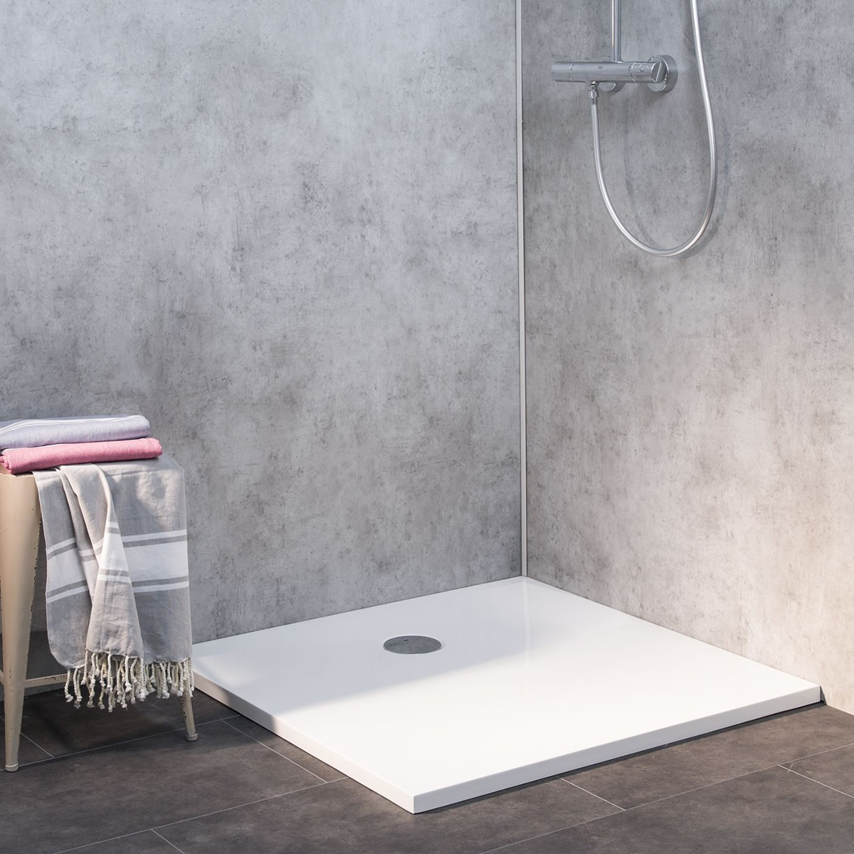 - Lieferung mit einem, auf das Duschelement abgestimmten, leistungsfähigen Siphon mit chromfarbener Flach-Abdeckung für die Ablauföffnung (Ø 90 mm) im Duschelement