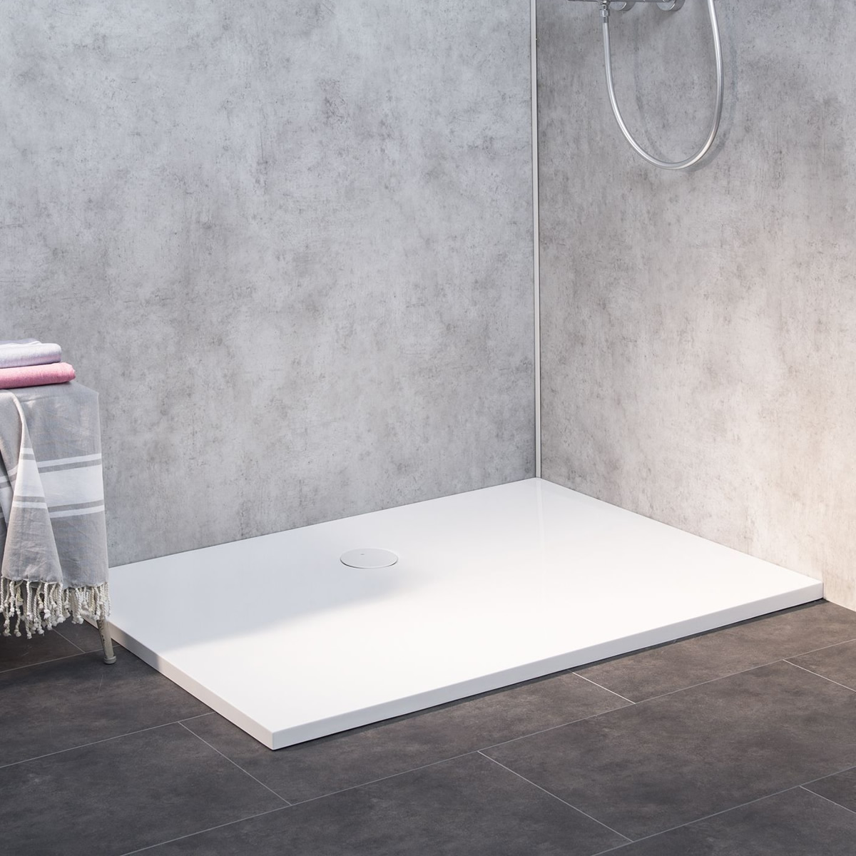 - Die weiße Flach-Abdeckung schafft optisch eine durchgehende Oberfläche des Duschelements in gleicher Farbe