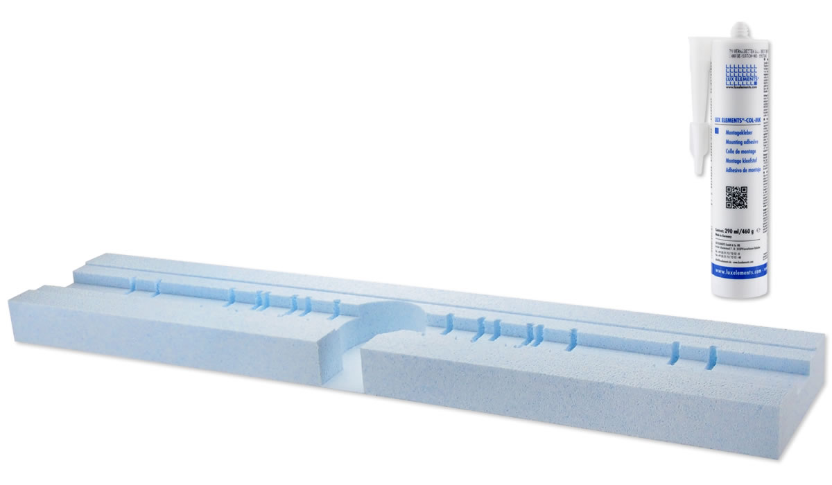 Lieferumfang: Montageanleitung und Montagekleber zum Einbau der Rinne in die Sanierungseinbauhilfe.
