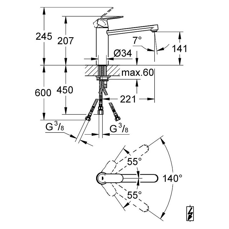 - Schwenkbereich [°]: 140