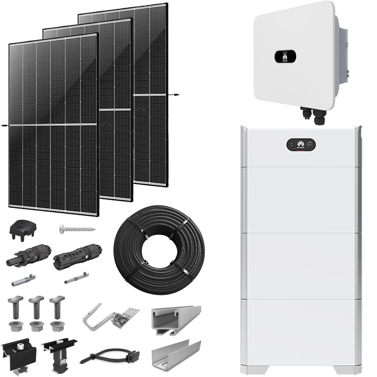 PV-Paket mit 36 leistungsstarken Solarmodulen, Huawei Wechselrichter und Huawei Speicher. Die Montage ist für 36 Module in der senkrechten oder waagerechten Installation ausgelegt. Das hierfür passende Befestigungssystem, Solarkabel, Anschlüsse und weiteres Zubehör sind im Lieferumfang enthalten.