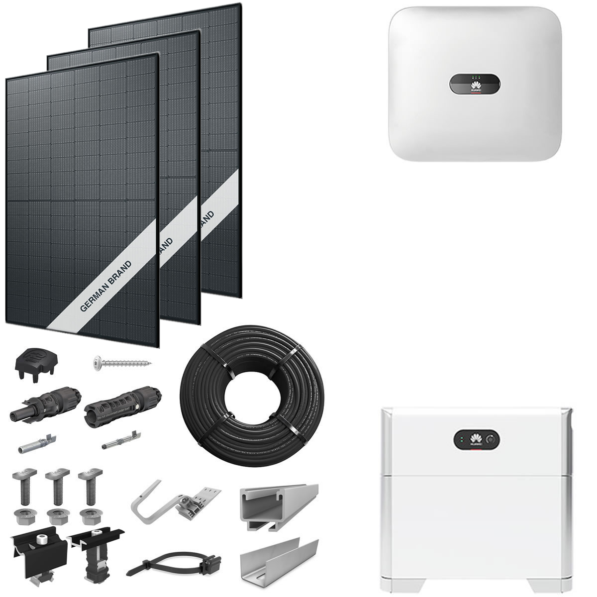 PV-Paket mit 12 leistungsstarken Solarmodulen, Huawei Wechselrichter und Huawei Speicher. Die Montage ist für 12 Module in der senkrechten oder waagerechten Installation ausgelegt. Das hierfür passende Befestigungssystem, Solarkabel, Anschlüsse und weiteres Zubehör sind im Lieferumfang enthalten.
