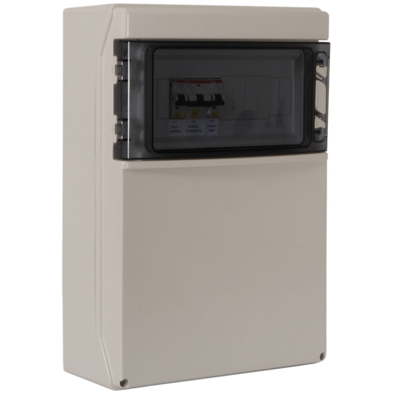 - Integrierte Absicherung Backup Last: C25A-Leitungsschutzschalter und 30 mA Fehlerstrom-Schutzschalter
