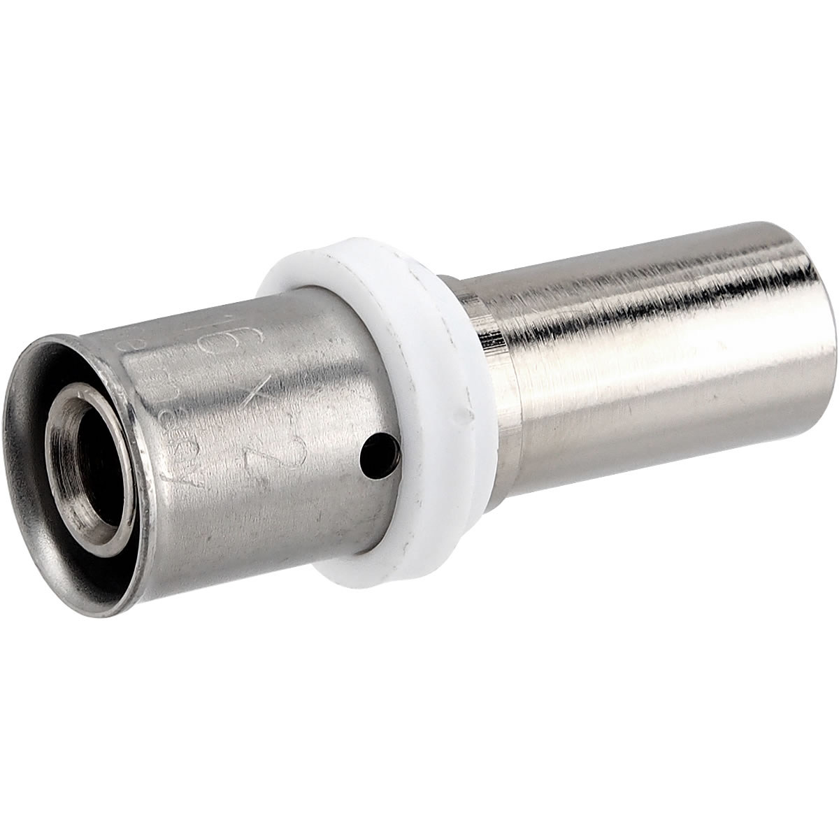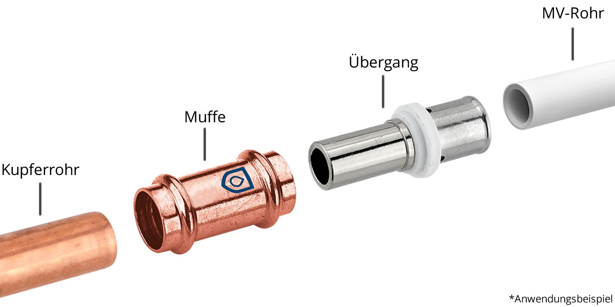 - Eine Edelstahlpresshülse mit Kontrollsichtfenster garantiert den richtigen Sitz des Rohres im Fitting.